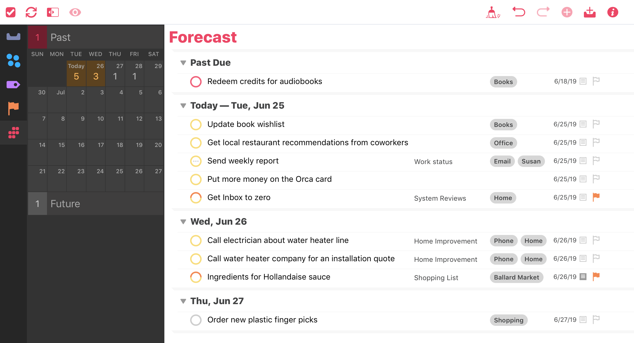 OmniFocus was designed specifically to align with the GTD methodology. The software incorporates many GTD cornerstones, such as context tags to align with different work modes (e.g., tasks that could only be completed using a specific device or in a certain location), and task deferment until a later date (this was a wonderful feature that let me “forget” about something until the day I actually had to do it).