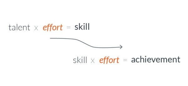 Duckworth explores the role of grit — a term she defines as a combination of passion and perseverance — in achieving long-term goals. She argues that while talent is important, grit is a more reliable predictor of one’s success. As she eloquently puts it in Chapter 3, “effort counts twice.” She presents the formula below to illustrate its role in achievement.